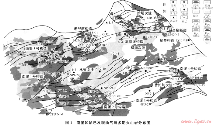 南堡凹陷源巖樣品熱模擬和三維生烴動(dòng)力學(xué)模擬結(jié)果都顯示,主力烴源巖古近系沙三段和部分東三段的熱演化程度大面積處于低成熟和成熟階段,僅E3s3在局部深洼或局部火山活動(dòng)地區(qū)高溫區(qū)進(jìn)入生氣階段,尚未達(dá)到大量生氣階段,導(dǎo)致南堡凹陷已發(fā)現(xiàn)油氣分布呈現(xiàn)油氣共生、大面積含油和局部富氣的特點(diǎn),其中天然氣富集區(qū)主要位于深洼區(qū)斜坡部位和火山巖分布區(qū)(圖1和圖5)。如在林雀次凹北部(預(yù)測(cè)其烴源巖生氣強(qiáng)度為32×108m3/km2)廟南斜坡區(qū)發(fā)現(xiàn)的廟4×1和廟16×1氣藏、北堡斜坡區(qū)發(fā)現(xiàn)的南堡5-10和南堡5-81油氣藏都與氣源巖成熟度和火山巖分布密切關(guān)。南堡4號(hào)構(gòu)造帶目前尚未發(fā)現(xiàn)氣井,推測(cè)可能與曹妃甸次洼源巖成熟度或生氣強(qiáng)度低(22×108m3/km2)以及火山巖不發(fā)育有關(guān)。