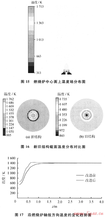 圖15為爐內(nèi)主射流溫升速度示意圖,圖16為新舊結(jié)構(gòu)截面溫度分布對比圖,圖中顯示新結(jié)構(gòu)爐內(nèi)溫度分布非常均勻,基本維持在1400K,與原結(jié)構(gòu)下的溫度場相比,射流外圍邊界上因為外環(huán)入口酸氣的通入溫度有所降低。但此區(qū)域內(nèi)氣體受回流區(qū)及氣體對流傳熱影響,溫度在很短距離內(nèi)即可達到爐內(nèi)平均溫度。圖17為沿燃燒爐軸線方向溫度的變化趨勢圖。由圖17可以看出,新結(jié)構(gòu)下射流中心區(qū)域溫升明顯加快,在很短的距離內(nèi)即可達到1400K。