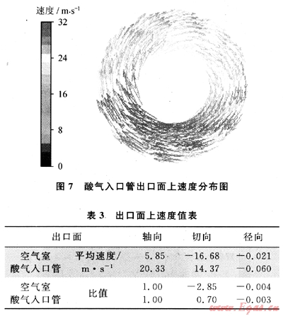 空氣室及酸氣入口管內(nèi)流場如圖4、5所示。圖6、圖7為空氣室及酸氣入口管出口面上的速度分布圖。表3所示為現(xiàn)役旋流裝置下空氣室和酸氣入口管出口面上的速度分量。流場計算完成后,將空氣室和酸氣入口管出口面上的速度參數(shù)作為燃燒爐爐體的空氣與酸氣入口條件對爐內(nèi)燃燒場進行數(shù)值模擬。