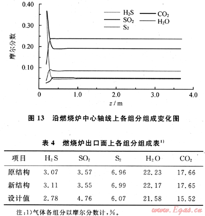 圖13為沿燃燒爐軸線方向各組分組成變化圖。由硫生成曲線來看,單質(zhì)硫在燃燒器內(nèi)增量最快,之后呈非常緩慢的增長趨勢。表4為改進前后燃燒爐出口面上各組分的組成表,由表4可知,出口處各組分含量與燃燒爐實際運行值較為吻合,而與原結(jié)構(gòu)相比,新結(jié)構(gòu)出口面上S2的摩爾分數(shù)提高了0.03%,說明采用外環(huán)酸氣入口提高了爐內(nèi)氣體混合效果并進而提高了燃燒爐的總硫轉(zhuǎn)化率。