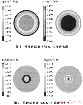 圖8、9分別為假定爐內(nèi)沒有反應發(fā)生時噴嘴前端(燃燒器直徑最小處)及燃燒器斜錐段xy截面上的組分分布圖。
