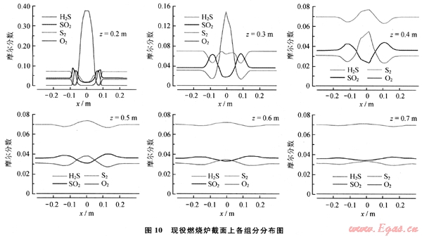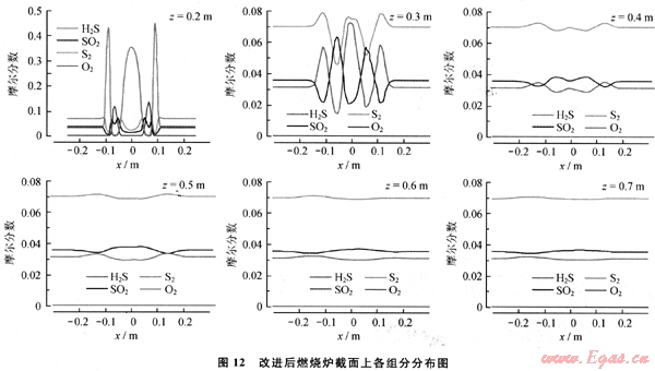 圖12為各組分在噴嘴前端沿xy截面中心軸線上的分布情況。對比圖10可知,H2S由原來的單駝峰式分布變?yōu)槎喾迨椒植肌Mㄟ^外環(huán)酸氣分流,提高了射流外圍處H2S的含量,外環(huán)酸氣直接通入到原S02濃度最大處,使此處的單質(zhì)硫生成量增多。由各組分濃度變化來看,H2S和S02的二次混合過程由原來主射流旋流擴散混合轉(zhuǎn)變?yōu)橹苯釉谏淞魍鈬吔鐚犹幓旌稀S蓤D12可知,爐內(nèi)組分在z為0.6m處即可基本達到平衡,說明采用外環(huán)酸氣入口將H2S直接通入S02濃度最大處,提高了H2S與S02的混合效果。
