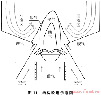主射流呈一種空氣包絡(luò)酸氣的分布形態(tài),此分布將導致O2消耗完畢后,射流中心區(qū)域內(nèi)H2S過量,射流外圍處S02過量。H2S與S02的混合將主要取決于主射流內(nèi)外氣體的不斷擴散完成,此混合過程相對較慢,對單質(zhì)硫的生成來講是不利的。為此,筆者提出了增設(shè)外環(huán)酸氣入口的結(jié)構(gòu)改進措施(圖11),外環(huán)酸氣入口貼近空氣室外壁面,入口方向與預混合段平行。通過此方法進行改進,可對射流中心處過量的H2S分流,并將其直接通入到射流外圍的S02濃度最大處。