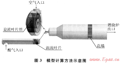 因為燃燒器內(nèi)具有旋流葉片,而且燃燒爐體積龐大又涉及燃燒反應,因此本次模擬對網(wǎng)格精度要求較高。鑒于此,筆者將燃燒爐分為空氣室、酸氣入口管及燃燒爐爐體3部分分別進行計算,計算示意圖如圖3所示,空氣室和酸氣入口管內(nèi)不涉及組分燃燒,此區(qū)域內(nèi)僅進行流場計算,而且單獨計算時出口截面邊界條件誤差微小,對兩出口截面上速度大小和方向的整體性影響不大。計算完成后利用profile功能將上述兩結(jié)構(gòu)的出口參數(shù)導出,作為燃燒爐爐體的空氣及酸氣入口條件。采用此方法對燃燒爐結(jié)構(gòu)進行模擬,可以大大減少網(wǎng)格數(shù)量,節(jié)省計算時間,并且提高計算精度。