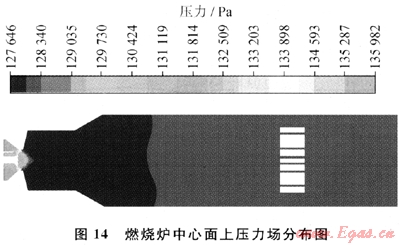 圖14為新結(jié)構(gòu)下燃燒爐內(nèi)的壓力分布圖。從圖14可以看出,壓降損失最大的區(qū)域為噴嘴至火焰區(qū)的收斂噴口處,火焰區(qū)內(nèi)處于負壓,出口處壓強約128kPa,入口處壓強最高為136kPa。爐內(nèi)總壓降為8kPa,與忠縣天然氣凈化廠內(nèi)燃燒爐設(shè)計壓降11kPa相比,減小了3kPa。因此新結(jié)構(gòu)在滿足現(xiàn)有硫回收功能的同時,能夠減小設(shè)備壓降,提高總硫回收率。