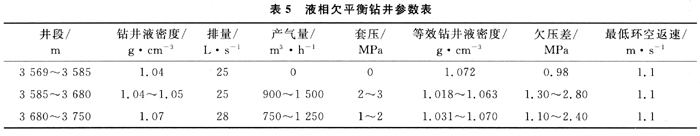2) 提高了機(jī)械鉆速,延長鉆頭壽命。欠平衡鉆進(jìn)過程中,鉆井液循環(huán)壓力低于地層壓力,消除了正壓差對巖屑的壓持效應(yīng),避免了巖石的重復(fù)研磨,提高了機(jī)械鉆速,延長了鉆頭壽命。欠平衡井段3569.2~3750.0m,進(jìn)尺180.80m,純鉆進(jìn)86.67h,平均機(jī)械鉆速2.09m/h,使用萬216mm牙輪鉆頭一只,鉆時(shí)超過6m/h的段長就有31m。