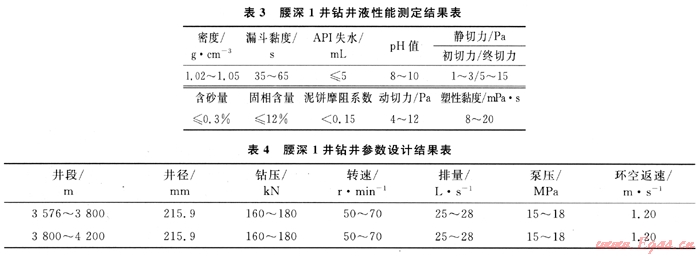 推薦使用牙輪鉆頭。從鄰井來看,DB11井從3381.3m鉆至井深4300m過程中共使用鉆頭15只,其中HA537鉆頭4只,HA637鉆頭10只,PDC鉆頭1只。其中在3885.70m下入PDC鉆頭,由于地層交錯,造成PDC鉆頭落井,無進(jìn)尺。根據(jù)腰深1井巖性和鄰井鉆頭使用情況分析,推薦牙輪鉆頭,型號為HJ637G。