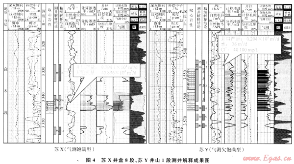 蘇X井盒8段(圖4),峰形飽滿(mǎn),全烴顯示厚度比儲(chǔ)層厚度大,氣測(cè)解釋為氣層,電測(cè)解釋氣層,綜合分析解釋為氣層,試氣獲無(wú)阻流量9.7914×104m3/d的工業(yè)氣流。蘇Y井山1段(圖4),全烴峰值顯示較低,峰形不飽滿(mǎn),全烴顯示厚度小于儲(chǔ)層厚度,氣測(cè)解釋為氣水同層,電測(cè)解釋為差氣層,綜合分析為氣水同層。經(jīng)測(cè)試井口產(chǎn)量0.035 4×104m3/d,水36m3/d,驗(yàn)證了利用聲波時(shí)差 電阻率圖版法與氣測(cè)綜合分析判斷識(shí)別氣水層的準(zhǔn)確性。