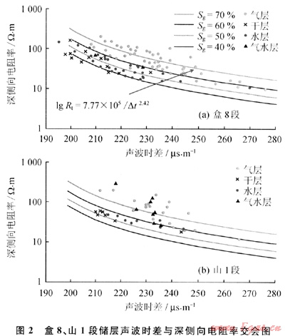 以蘇里格西部地區(qū)的完試資料基礎(chǔ)做分層位聲段聲波時(shí)差-深側(cè)向電阻率-含氣飽和度交會(huì)圖(盒8、山1段儲(chǔ)層及地層水礦化度不同),利用該圖版(圖2)可以看到:首先氣水層的電阻率沒(méi)有固定的界線(xiàn)值,隨著聲波時(shí)差的增大,氣層的電阻率降低;同時(shí),根據(jù)含水飽和度情況,可以在一定的波動(dòng)范圍內(nèi)酌情調(diào)整巖電參數(shù),使含水飽和度模型趨于合理化,氣水識(shí)別精度有了相應(yīng)的提高。