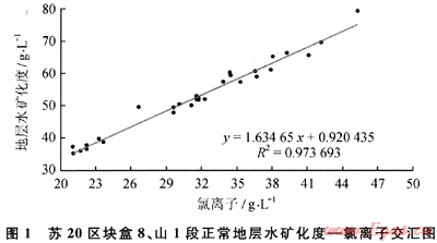 蘇20區(qū)塊盒8、山1段的地層水中氯離子含量在20320~49060mg/L,占陰離子總量的98%以上。地層水礦化度與Cl-含量交會(huì)圖(圖1)中的交會(huì)線(xiàn)對(duì)應(yīng)性很好,表明地層水中的Cl-嚴(yán)格控制總離子量,氯離子和礦化度幾乎同步等速變化。