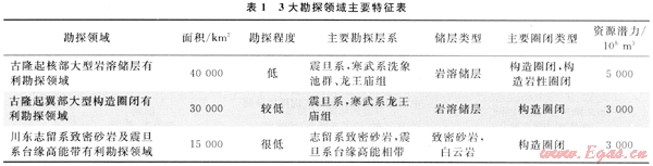 以上分析表明,四川盆地震旦系-下古生界具有有利的油氣成藏條件,資源潛力大,但勘探程度仍然很低,勘探前景廣闊。從勘探程度及研究、認識程度綜合分析,主要有3大勘探領(lǐng)域,即古隆起核部大型巖溶風(fēng)化殼勘探領(lǐng)域、古隆起翼部大型構(gòu)造圈閉勘探領(lǐng)域和川東志留系致密砂巖及震旦系臺緣高能帶勘探領(lǐng)域,各領(lǐng)域的主要特征見表1。