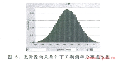 同時,由于活動資源是有限的,活動歷時在按其分布隨機變化過程中,還必須受資源的約束。如2.2節(jié)所述:活動工時=活動歷時×資源單位,在資源單位一定的情況下,按其概率分布抽取出來的活動歷時如果不能滿足約束條件,仍將被過濾掉,不得不重新進行抽樣。如此往復循環(huán),直到抽到足夠的數(shù)據(jù)進行模擬分析[5][10]。