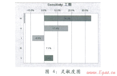 靈敏度圖(圖4)給出了各個假設單元格(即活動歷時)及該單元格與預測單元格(項目工期)的相關聯(lián)系數(shù),關聯(lián)系數(shù)顯示了活動歷時與項目工期之間的依存關系的強度。