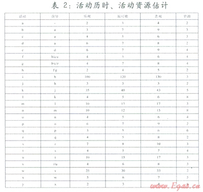 根據(jù)ERP項目實施過程和各階段活動之間的邏輯關系,基于專家三點評估得到的活動歷時、活動資源單位如表2所示: