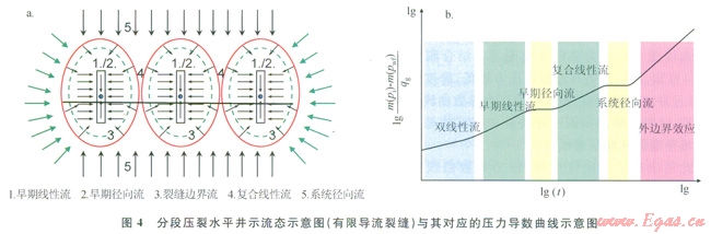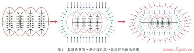 裂縫邊界流之后,壓力擾動將逐漸覆蓋儲層有效壓裂體積的整個范圍,并進入復合線性流,其特征如同氣體流入一條大的裂縫。該流態(tài)不是一個單純的線性流,而是垂直于水平井筒的線性流為主導,水平井段兩端的流線則成橢圓形,兩端的橢圓流的效應小于垂直水平井筒的線性流。