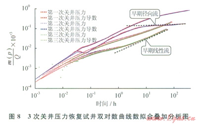 從圖8中可以看出,后2次關井壓力恢復雙對數(shù)圖明顯不同于第一次關井壓力恢復雙對數(shù)圖,這歸因于后2次關井壓力起始點較高,壓力跨度范圍較小,井儲效應和井底積液的影響大大減小,壓力導數(shù)曲線沒有出現(xiàn)負斜率。后2次關井由于關井時間較短,僅有5d,主要表現(xiàn)出早期線性流特征,沒有出現(xiàn)徑向流。因此,要展現(xiàn)頁巖氣分段壓裂水平井井比較完整的流態(tài)特征,獲取準確的儲層和裂縫參數(shù),需要較長的關井時間,確保壓力計盡量靠近水平段位置,并選擇合適的關井點以最大限度地降低井儲和井底積液的影響。