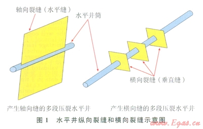 通常水平井分段壓裂裂縫存在2種極限情況:縱向和橫向(圖1)。當水平井井筒方位與最大水平主應力方位垂直時,可產生橫向裂縫;當兩者方位一致時,可產生軸向裂縫(縱向裂縫);當兩者夾角處于其他情況時,裂縫形態(tài)會非常復雜。由于水平井軸向裂縫有效泄流面積相對橫向裂縫來說小很多,一般希望水平井壓裂產生橫向裂縫作為裂縫網絡的主裂縫。頁巖氣井最佳的壓裂效果是產生垂直于水平井段的橫向主裂縫的同時,產生垂直于橫向裂縫的二級裂縫,以提高裂縫與地層的接觸面積,有利于頁巖氣的解吸附和氣體在儲層中的流動。據(jù)統(tǒng)計,水平井分段壓裂的裂縫以橫向裂縫為主[3-5]。