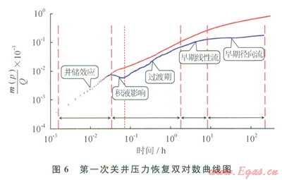 第一次關井(關井時間為30d)壓力恢復雙對數(shù)圖如圖6所示。
