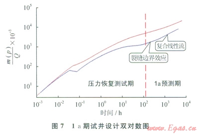 從圖7中的la預測期可以看出,壓力恢復測試期過后表現(xiàn)為裂縫邊界流和復合線性流特征,氣井生產1a仍然沒有出現(xiàn)系統(tǒng)徑向流和外邊界效應,同時也驗證了測試期出現(xiàn)的線性流和徑向流分別為早期線性流和早期徑向流。