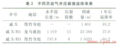 目前頁巖氣藏通常采用“低砂比”體積壓裂,裂縫寬度相對更小,因此頁巖氣藏返排時(shí)間長,返排率低是客觀必然。表2是某頁巖氣藏氣井的壓裂液返排數(shù)據(jù),可以看到商井的返排率最高,水平井水平段越長,壓裂規(guī)模越大,返排率越低。這與上面認(rèn)識(shí)一致,即壓力規(guī)模小,壓裂液更集中在井底附近的大尺度網(wǎng)絡(luò)縫隙中,返排率相對較高;壓裂規(guī)模入,壓裂液更多地分散在小尺度縫網(wǎng)中,返排率更低。