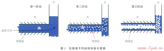 壓裂液在進(jìn)入貞巖之后,其返排過程大致可以分為以下3個(gè)階段(圖1):第一階段,水力壓裂裂縫中壓裂液的壓力(pf)大于原始地層壓力(pi)時(shí),由于壓裂液與巖石的綜合壓縮能,壓裂液會(huì)少量攜帶游離氣返排出來,此時(shí)反排難度最小;第二階段,當(dāng)pf<pi時(shí),此時(shí)處于生產(chǎn)初期,裂縫中為氣液兩相流動(dòng),氣體會(huì)驅(qū)替液體返排,此過程反排難度較??;第三階段,當(dāng)pf<pi時(shí),此時(shí)處于生產(chǎn)中后期,裂縫中自由水已經(jīng)被大量返排,而殘留在裂縫表面的水需要?dú)怏w大于臨界攜液流速才能帶走。