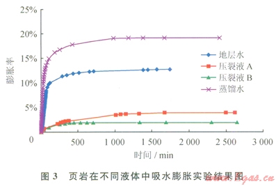 實(shí)驗(yàn)中使用的液體分別為蒸餾水、地層水、壓裂液A和壓裂液B,實(shí)驗(yàn)結(jié)果如圖3所示。可以看到頁巖在蒸餾水中的膨脹率最高,接近20%;而壓裂液中頁巖的膨脹率比地層水和蒸餾水明顯低很多,說明了壓裂液在抑制頁巖吸水膨脹方面效果不錯(cuò)。
