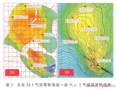 樂東22-l氣田三維地震解釋與二維解釋的構(gòu)造認(rèn)識發(fā)生了較大變化,以N1y2Ⅰ,工氣組為例,原二維資料解釋存在“Y”形斷層,但在三維資料解釋后斷層并不存在(圖3)。另外,三維地震解釋后部分主力氣組的構(gòu)造高點和幅度也發(fā)生了明顯的變化。為了減少構(gòu)造對氣田開發(fā)的影響,進行了儲層精細描述,并以此來優(yōu)選井位和指導(dǎo)隨鉆井軌跡調(diào)整,為氣田開發(fā)成功實施奠定了基礎(chǔ)。