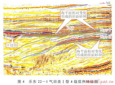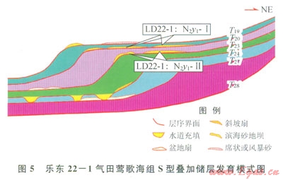 樂東22-1氣田主物源來自北東方向的海南島,為發(fā)育在陸架濱 淺海背景下,受沉積坡折控制的灘壩復(fù)合體沉積。儲層的形成,與海平面短期快速升降、強制性海退背景下形成的4級層序有關(guān)。4級層序界面以類工型界面為主,層序結(jié)構(gòu)主要表現(xiàn)為前積型特征,頂積層較薄(圖4)。S型疊加4級層序的頂積層可形成良好的儲集層,在沉積坡折以下多以淺海相泥巖、泥質(zhì)粉砂巖為主,儲層不發(fā)育(圖5)。準(zhǔn)確把握層序形成機制和疊加樣式[7-8],可以有效地預(yù)測和把握有利儲層的分布,減少儲層預(yù)測上的失誤,降低風(fēng)險。通過對儲層的精細描述,刻畫有利砂體的展布,指導(dǎo)生產(chǎn)井的部署和井位優(yōu)化。