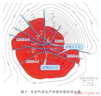 如前所述,筆者工作中采用的3種改進方法均能有效地提高斷層,特別是微、小的解釋精度,但單一的方法有時還是會難以給出最優(yōu)解釋方案。因此,工作中結(jié)合了常規(guī)的斷層解釋方法和這3種特殊的解釋手段。經(jīng)多體綜合解釋得到樂東15-l穹隆背斜構(gòu)造的斷層空間展布和組合關(guān)系,這為氣田的開發(fā)方案優(yōu)化提供了可靠的基礎(chǔ)。圖9是結(jié)合筆者斷層描述結(jié)果優(yōu)化前后的樂東15-1氣田開發(fā)井對比圖,從圖9中可以看到,優(yōu)化后的井位規(guī)避了生產(chǎn)井鉆到斷面的風險,同時確保了每個儲量規(guī)模大且又相對獨立的斷塊均有生產(chǎn)井動用到。此外,在生產(chǎn)井軌跡優(yōu)化過程中還考慮到了斷面空間分布對后期生產(chǎn)井側(cè)鉆的影響。