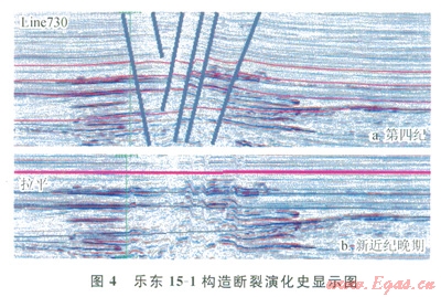 樂東l5-1構(gòu)造底辟的活動[8]分為兩個期次,導致斷層的發(fā)育也分為兩個期次。第一個活動期次是在新近系晚期,在第四紀前結(jié)束;因此,受本期底辟活動影響而發(fā)育的斷層組在新近紀以后也基本停止活動(圖4-b),該組斷層走向近似南北向(圖3);到第四紀早期,底辟活動加劇,發(fā)育更多斷層且斷距較之前發(fā)育的斷層增大(圖4-a);第四紀中晚期以后,泥底辟活動漸趨減弱或停滯,斷層活動也基本停止。第四紀發(fā)育的斷層以穹隆背斜的中心為圓點,向四周放射狀分布,且均為正斷層。南北向的斷層由于形成時間相對較早,被后期近東西向的斷層切割。