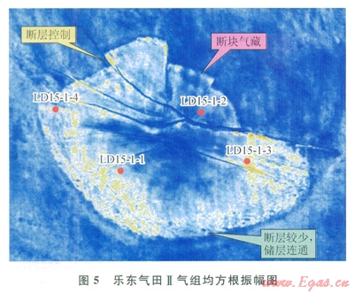 研究認為[9]:在泥底辟活動過程中發(fā)育的斷層,由于塑性流體的活動,造成斷層泥在斷面上的涂抹較為均勻,而大幅提升了斷層的側(cè)向封堵能力。地震資料顯示并經(jīng)鉆井資料所證實,放射狀分布的斷層將樂東氣田平面上分隔多個氣藏,背斜北部各斷塊氣藏間的氣水界面不同、氣體的組分也存在差異,這樣的氣藏分布導致了開發(fā)井的動用效率低,難以提高氣田開發(fā)的采收率。在背斜南部l、3、4井區(qū)從地震屬性平面圖分析應該屬同一氣藏,且利用常規(guī)資料和方法解釋得到的斷層分布圖也顯示,各塊低部位的氣藏是連通的,基本可以判斷為同一氣藏(圖5)。但l、3、4井資料顯示各井的氣體組分差異較大,其中1井CO2含量16.7%、4井CO2含量70.4%、3井CO2含量79.7%,難以劃歸為同一氣藏。因此,推測還存在一些常規(guī)手段和方法無法解釋的小斷層或微斷層將背斜南部分隔成至少3個獨立氣藏,而這些可疑微、小斷層的不確定性就嚴重影響對氣田的認識和生產(chǎn)井的合理部署。