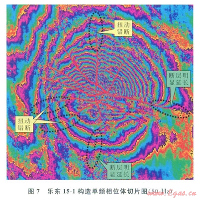 圖7是樂東l5-1氣田80Hz單頻相位體切片,圖中可以看到,原地震剖面所識別斷層延長線上,相位資料還明顯發(fā)生扭動或錯斷,因此可解釋出常規(guī)資料和方法無法識別的微、小斷距的斷層,使得原有多條斷層的解釋方案向外延伸,致背斜構(gòu)造北部的平面分塊更可靠,背斜的南部也在橫向上分成了4~5個斷塊,合理的解釋了構(gòu)造南部各井氣體組分差異的原因。