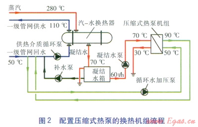 配置壓縮式熱泵的換熱機(jī)組流程見圖2。