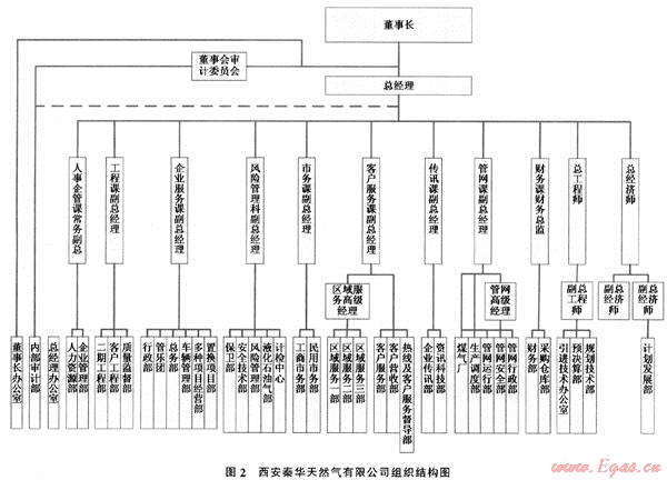 架構(gòu)重組后的部門設(shè)置以“使客戶滿意的流程”為中心,把同類業(yè)務(wù)整合到一起,這樣可以強(qiáng)化專業(yè)化管理,優(yōu)化專業(yè)技術(shù);優(yōu)化人力資源,減少勞動(dòng)定員,避免同一專業(yè)崗位工作忙閑不均的問(wèn)題;減少開資。降低消耗。提高極具設(shè)備、原材料、能源、技術(shù)等各種資源的綜合利用水平。重組后的西安秦華天然氣有限公司組織結(jié)構(gòu)圖如圖2所示。