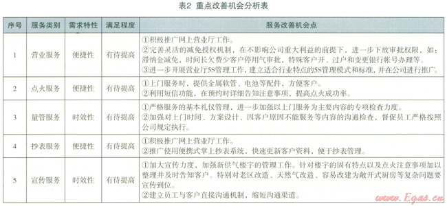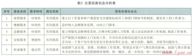 在通過上門服務、專項調(diào)查、定期走訪、業(yè)務回訪、服務熱線、營業(yè)咨詢、市長熱線、民心橋等多種信息收集手段的基礎上,對l0大服務類別的3層次需求特性進行滿足度分析(見表l)。細分各項服務滿足客戶需求程度是尋找服務改善點的基礎。