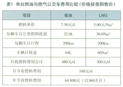 (4)LNG公交車兩天加一次氣,比CNG公交車減少了加氣次數(shù),且兩天為加氣往返里程減少一次,如貴陽每次加氣所需的往返里程平均5km左右。為此,采用LNG公交車既減少了為加氣所需的往返里程,又節(jié)約了因往返里程產(chǎn)生的燃料消耗與運(yùn)行費(fèi)用。若按照一次加氣所需的往返里程5km計,一年(以360天計)一輛LNG公交車可節(jié)約900km,可年節(jié)約天然氣270m3。