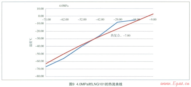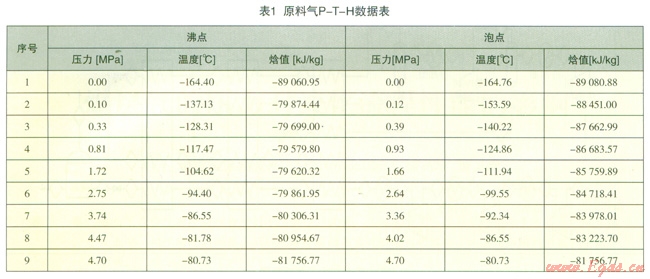 在特定壓力下,利用根據(jù)圖l建立的系統(tǒng)模型對(duì)煤層氣從初溫-40℃冷卻至-l40℃的過(guò)程中對(duì)煤層氣的T-H進(jìn)行模擬計(jì)算,結(jié)果詳見(jiàn)表2。
