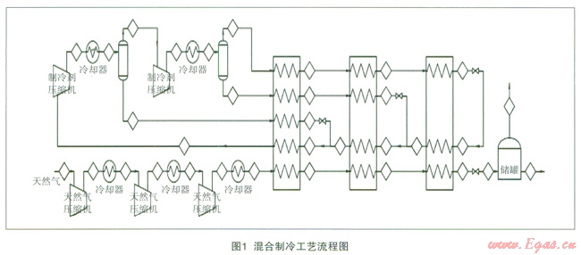 流程簡(jiǎn)述:天然氣原料通過(guò)壓縮機(jī)一級(jí)壓縮并和循環(huán)水換熱,然后通過(guò)二級(jí)壓縮二次和循環(huán)水換熱,再經(jīng)過(guò)三級(jí)壓縮換熱進(jìn)入換熱器(LNGl00)和制冷劑一次換熱,再經(jīng)換熱器(LNGl01)二次換熱,最后進(jìn)入換熱器(LNGl02)換熱流入LNG大罐。另一路為制冷劑閉路循環(huán)從板翅式換熱器LNGl00復(fù)熱回來(lái)的制冷混合劑經(jīng)離心壓縮機(jī)一級(jí)壓縮換熱,流出分兩路,液體進(jìn)入板翅式換熱器進(jìn)行節(jié)流換熱。一路混合氣體再次經(jīng)二級(jí)壓縮換熱,分兩路氣體和液體氣體一路進(jìn)入板翅式換熱器,二級(jí)壓縮分離出來(lái)的液體經(jīng)板翅式換熱器(LNGl00、LNGl00、LNGl00)換熱匯總到離心壓縮機(jī)進(jìn)口。