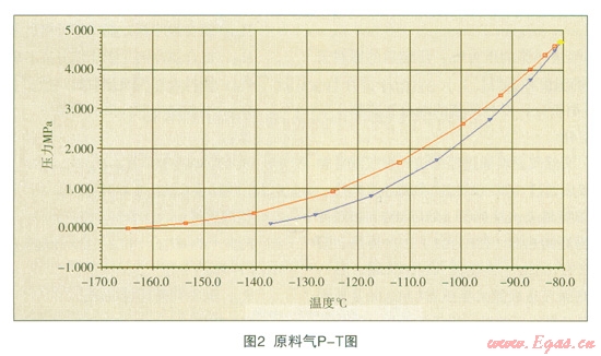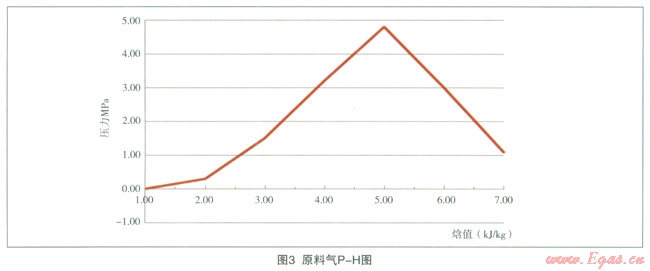 利用流程模擬圖可以原料氣P-T-H(P:壓力、T:溫度、H:焓值)的相關(guān)數(shù)據(jù),具體數(shù)據(jù)及曲線圖見(jiàn)表1、圖2、圖3。