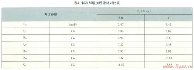 同時(shí)由圖4可以看出,隨著Pn的降低,原料氣的液化曲線不斷下移,而且愈加不平滑,由圖5~圖8可見(jiàn)換熱器(LNGl02)最小換熱溫差逐漸變小,當(dāng)壓力降至4.0MPa時(shí)最小溫差變?yōu)樨?fù)值,換熱器(LNGl02)無(wú)法收斂。此外由于換熱溫差減小,導(dǎo)致LNG換熱器的UA值不斷增大。對(duì)于已建工廠,由于換熱器的體積一定,且換熱器內(nèi)流體的流動(dòng)狀態(tài)、各項(xiàng)物性參數(shù)也不會(huì)發(fā)生太大變化,因此其UA值也基本是一個(gè)定值,因此此時(shí)若不對(duì)制冷劑組分進(jìn)行調(diào)整,則需增加制冷劑的循環(huán)量。在保證LNGl02換熱器UA基本不變的情況下增加制冷劑循環(huán)量處理每kmol原料氣的計(jì)算數(shù)據(jù)見(jiàn)表4。