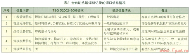 表3是目前全自動型熱熔焊機焊口信息記錄情況。從表中可看出,大部分焊機記錄的焊口信息既存在信息不齊全的問題,義存在術(shù)語表述不符合同家安全技術(shù)規(guī)范[13]的不足。常見缺省的內(nèi)容包括焊接設(shè)備信息和焊接參數(shù)信息。然而,對于焊口質(zhì)量管理來說,只有焊口信息完備且具有可追溯性才具有真正的意義。
