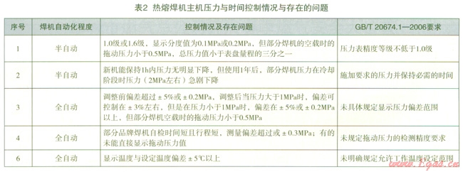 表2是檢測結(jié)果中常見的熱熔焊機主機的控制壓力和溫度性能中存在的問題。從表中可看出不少半自動型焊機的壓力表精度等級明顯低于同家標準[12]要求,并且存在保壓能力不足的問題。這表明焊機的控壓系統(tǒng)元件的等級不符合要求且性能易發(fā)生劣化。對于全自型焊機,由于國家標準對全自動熱熔焊機的壓力控制精度和工作溫度控制精度缺乏明確的規(guī)定,大部分焊機的壓力和溫度控制情況差異很大,且存在不少焊機的壓力與溫度控制偏差很大。