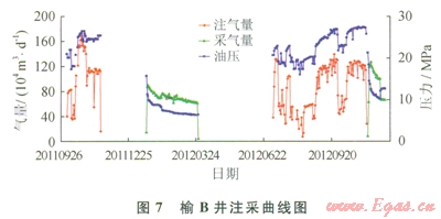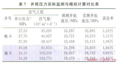 榆林南注采試驗井榆A和榆B井注氣過程中,井筒壓力損失分析見表7所示,計算壓力損失與實測的誤差小于2%?,F(xiàn)場試驗表明,室內(nèi)節(jié)點分析軟件模擬計算結果符合氣井實際運行工況。