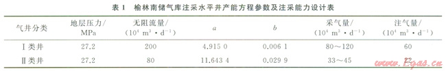 由于儲層非均質(zhì)性強,氣井產(chǎn)能存在差異,榆林南儲氣庫注采井按照采氣量2類井(表1)設計。氣井二項式產(chǎn)能方程[2]如下: