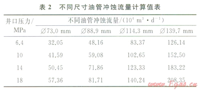 高速流動的氣體在金屬表面上運動,在氣體雜質(zhì)機械磨損與腐蝕介質(zhì)的共同作用下,會使油管腐蝕加速。實踐表明,氣體流速超過21.3m/s時,管柱沖蝕趨于嚴重。儲氣庫注采井運行過程中井口壓力為整個井筒壓力分布的最低點,沖蝕分析選擇井口為研究點。表2是不同油管在對應井口壓力下的沖蝕流量[6-8]。