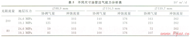 注氣產(chǎn)能方程采用與采氣產(chǎn)能方程同一個產(chǎn)能方程。在注氣壓力28MPa條件下,分別計算各類井的注入能力(表5)。綜合考慮協(xié)調(diào)點注氣量和沖蝕流量,3種油管均能夠滿足注氣量要求。計算結果同時也表明,滿足采氣要求的油管尺寸均能夠滿足注氣要求。