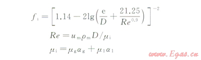 式中fi為氣液界面摩擦系數(shù),無因次;D為管道當(dāng)量直徑,m;Re為雷諾數(shù);mi為混合物黏度,Pa·s;mg為氣相黏度,Pa·s;ag為空泡率;m1為液相黏度,Pa·s;a1為持液率;CD為阻力系數(shù),無量綱,是Re的函數(shù):rm為混合物真實密度,kg/m3;um為氣液混合速度,m/s;當(dāng)um繼續(xù)增大,該平衡狀態(tài)將被打破,巖屑開始運移;ui為巖屑顆粒床平均摩阻系數(shù),無因次;e為巖屑顆粒堆積空隙程度,無因次;a/b與巖屑堆積程度相關(guān),無因次。