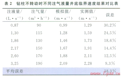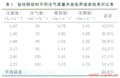 臨界流速是指巖屑發(fā)生躍移時的最低混合物流速。在達到臨界攜巖的狀態(tài)下,實測了氣液兩相混合真實攜巖臨界速度,再與多相流數(shù)值模擬軟件計算出的臨界混合速度對比,得出兩者的誤差。表l、2為鉆柱轉(zhuǎn)動和鉆柱不轉(zhuǎn)動時的結(jié)果對比。
