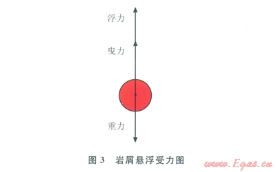 跳起的巖屑當(dāng)落到下井壁時對巖屑床的巖屑有沖擊作用,作用力的大小則與其躍起的高度和鉆井液流速有關(guān)。若巖屑躍起較低,則其從液流中取得的動量不大,在落回巖屑床后不會繼續(xù)跳動。若躍起較高,則落到巖屑床后還可以重新跳起。躍起高度與鉆井液密度成反比,這就是在水平井中巖屑運移的最為特殊的一類運動方式——躍移,巖屑躍移受力圖如圖7所示。