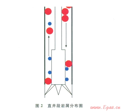 由于管流運動與巖屑顆粒重力的方向性差異,直井段與水平井段巖屑運移規(guī)律大為不同(圖1、2)。由圖l可以看出:在鉆頭破巖后大顆粒尺寸巖屑在鉆鋌處由于流速高可以較為順暢地運移;到了鉆鋌與鉆桿交界處由于環(huán)空面積陡然增加,大顆粒巖屑可能發(fā)生堆積。對比直井段與水平井段,直井段中較大巖屑會回落至井底重復(fù)破碎;而水平井段一旦產(chǎn)生流體所不能攜帶的大顆粒巖屑,這些巖屑只會停留在下井壁等待鉆具的碾壓直至形成小顆粒才被流體順利攜走。